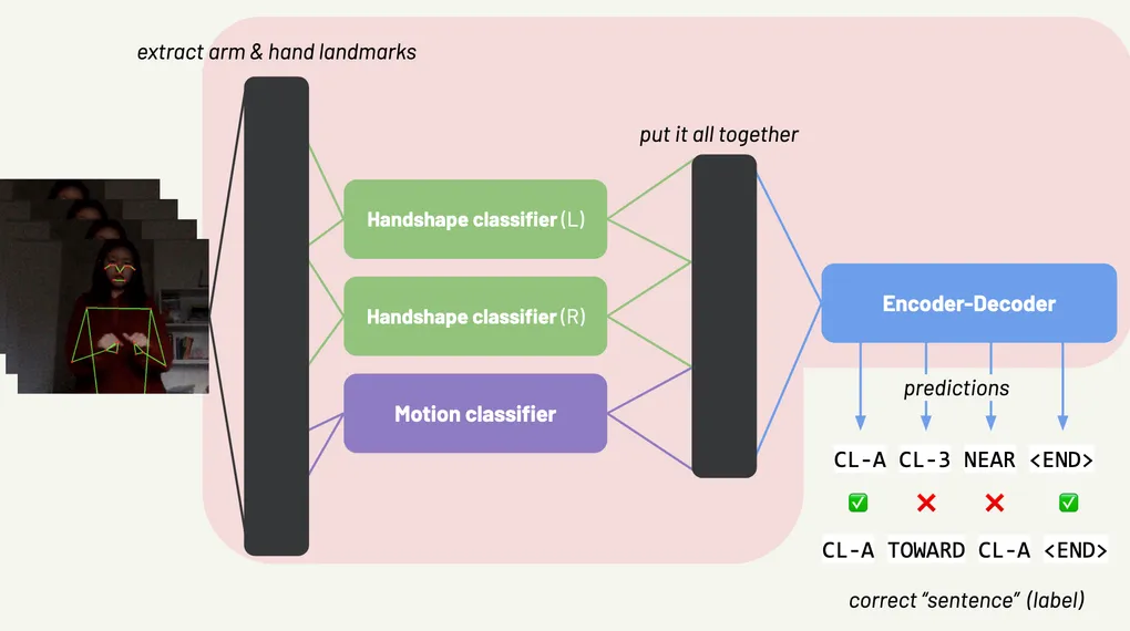 This is a stub blog post, which I’ll fill in later! But the TLDR is that existing sign language recognition (SLR) systems were designed to detect a linear sequence of hand symbols, which is an oversimplification of how sign language works. The goal of this project was to demonstrate that an encoder-decoder is capable of recognizing both handshapes and motion within a single gesture, and correctly output the tokens in the correct order, based on the training data. I led this project under P-ai, where I mentored students in fundamental ML techniques while we built the system. Check out these summary slides for more info!