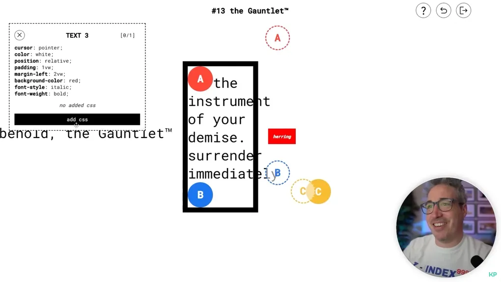 Still, Kevin’s playthrough felt like a balm for the hypercritical Hacker News response: I could see him generally having a good time getting nerdsniped, and he avoided obvious cheats that went against the spirit of the game. Kevin’s video also gave me the perfect footage I needed to make a frustration-filled supercut, and it brought to my attention a few more oversights in the game design. For example, there were a few properties that players could use to sneakily circumvent existing position properties, like (margin|padding)-(block|inline)-(start|end) and inset-*. But thanks to the magic of open source, those issues were patched by a contributor.